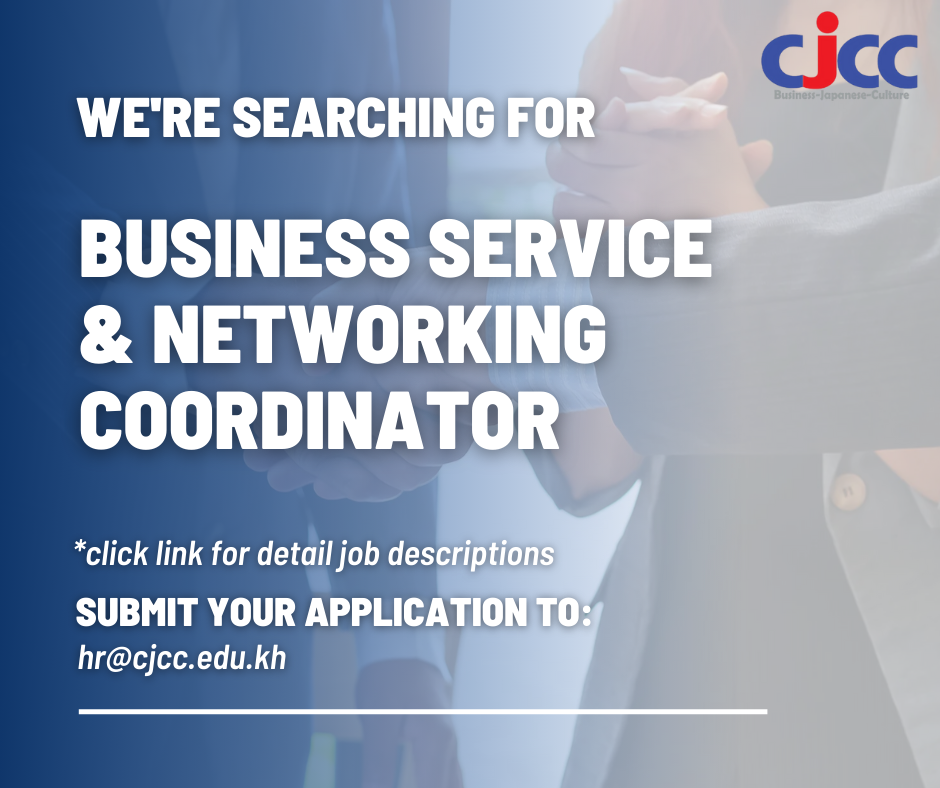 The Cambodia-Japan Cooperation Center (CJCC) is now seeking qualified candidates to fill a position as Business Service and Networking Coordinator as in the following.