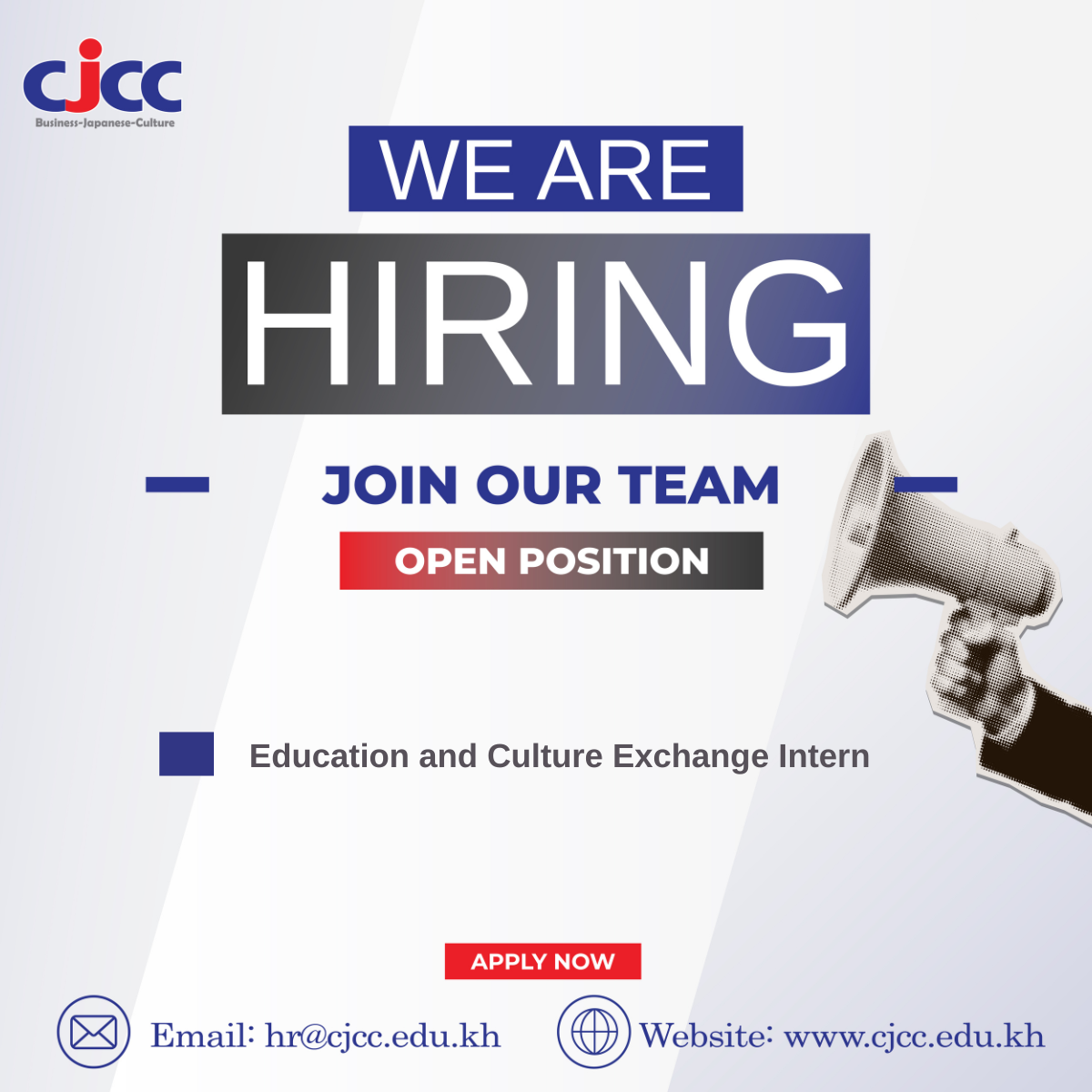How to Apply: Interested candidates are invited to submit a cover letter, full resume, and supporting documents to: hr@cjcc.edu.kh Subject line: Application – “Education and Culture Exchange Intern” (Please mention how you found this job announcement.)