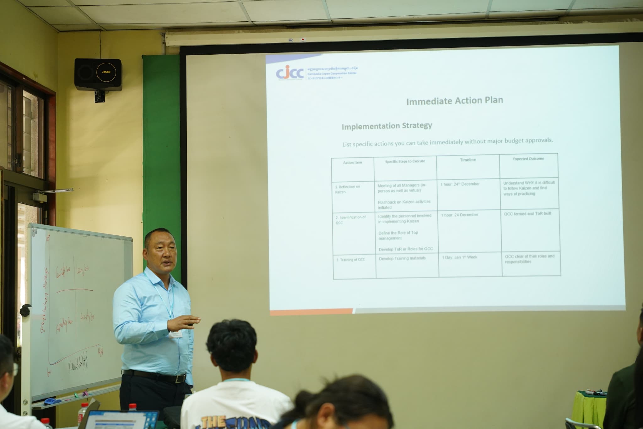 Through lectures and interactive workshops, participants explored the core principles of KAIZEN, a Japanese management philosophy widely respected around the world. Rather than focusing only on theory, the program emphasized how KAIZEN can be practiced in real workplaces and sustained over time. To deepen this understanding, participants visited two Cambodian companies that have successfully adopted KAIZEN.