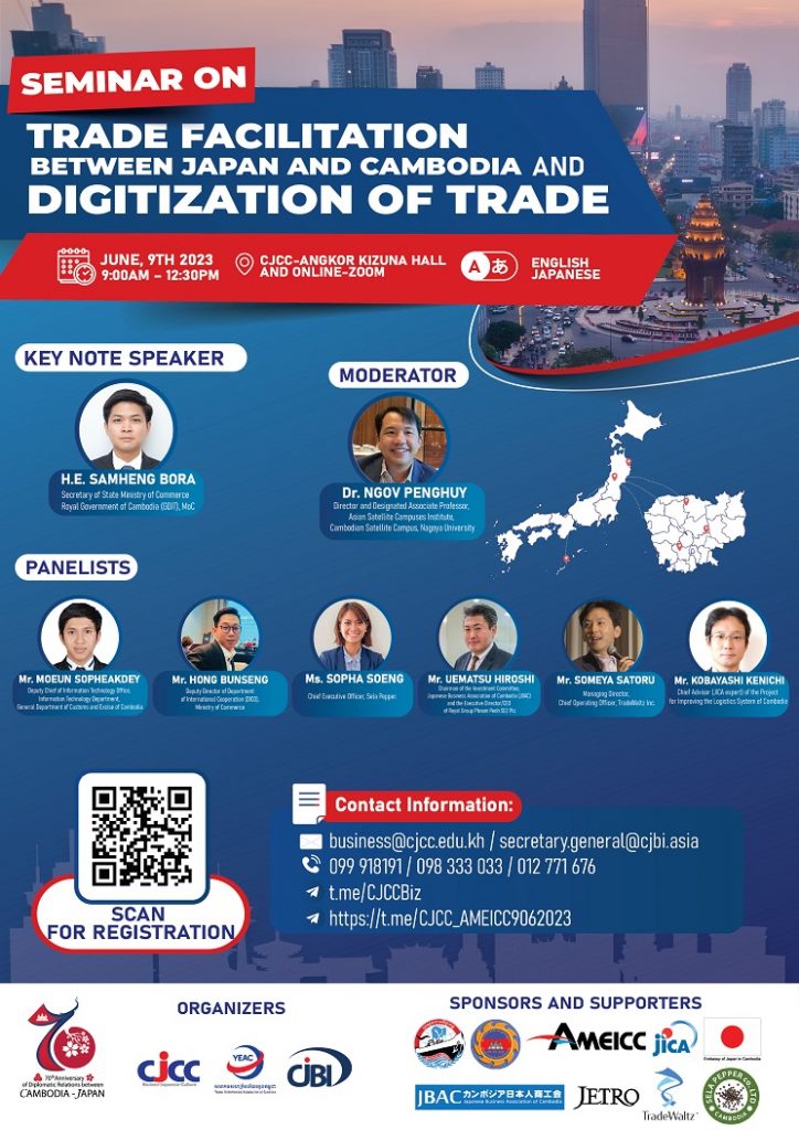 カンボジア日本ビジネス投資協会(CJBI)、カンボジア日本人材開発センター(CJCC)およびカンボジア若手起業家協会(YEAC)は6月9日(金)に「日本・カンボジア間の貿易の円滑化とデジタル化」というタイトルの下でセミナーを開催いたします。本セミナーはCJCC(対面)およびZoom(オンライン)で開催いたします。